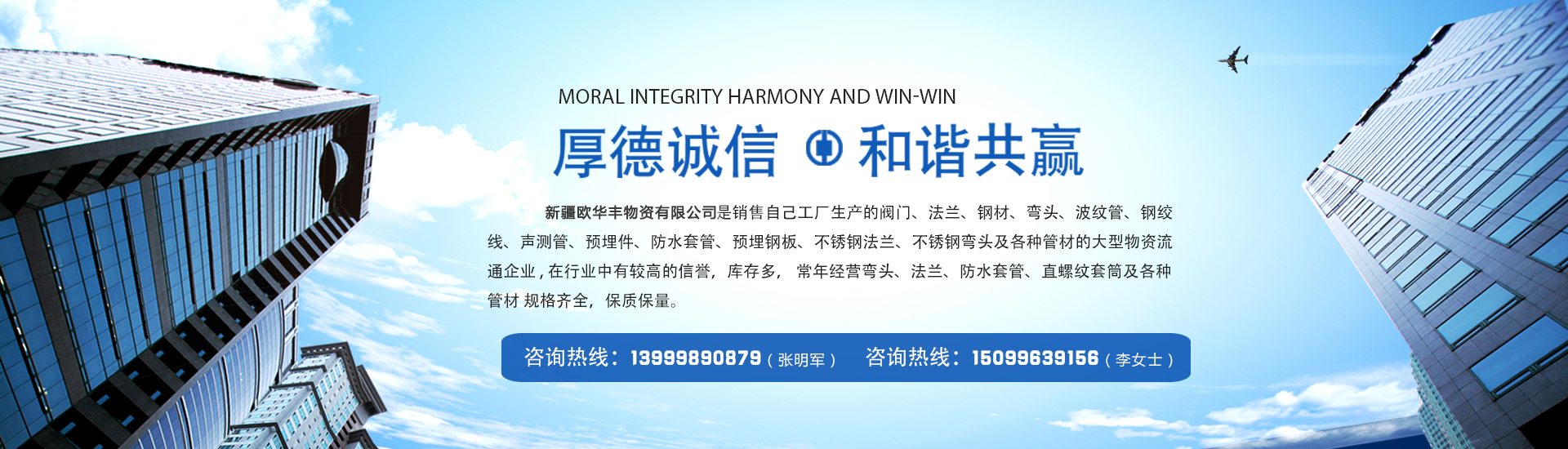 新疆歐華豐物資有限公司是銷售自己工廠生產(chǎn)的彎頭 法蘭 防水套管 及各種管材的大型物資流通企業(yè) , 在行業(yè)中有較高的信譽(yù),庫(kù)存多,常年經(jīng)營(yíng)閥門、法蘭、鋼材、彎頭、波紋管、鋼絞線、聲測(cè)管、預(yù)埋件、防水套管、預(yù)埋鋼板、不銹鋼法蘭、不銹鋼彎頭及各種管材 規(guī)格齊全,保質(zhì)保量。 公司一貫以: 服務(wù)上乘、質(zhì)量?jī)?yōu)質(zhì)、價(jià)格合理、客戶至上、服務(wù)周到、讓利客戶、薄利多銷為原則,誠(chéng)實(shí)守...